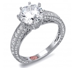 Cathedral setting tapered shoulder engagement ring featuring pavé-set round diamonds set 3/4 down the shank.