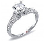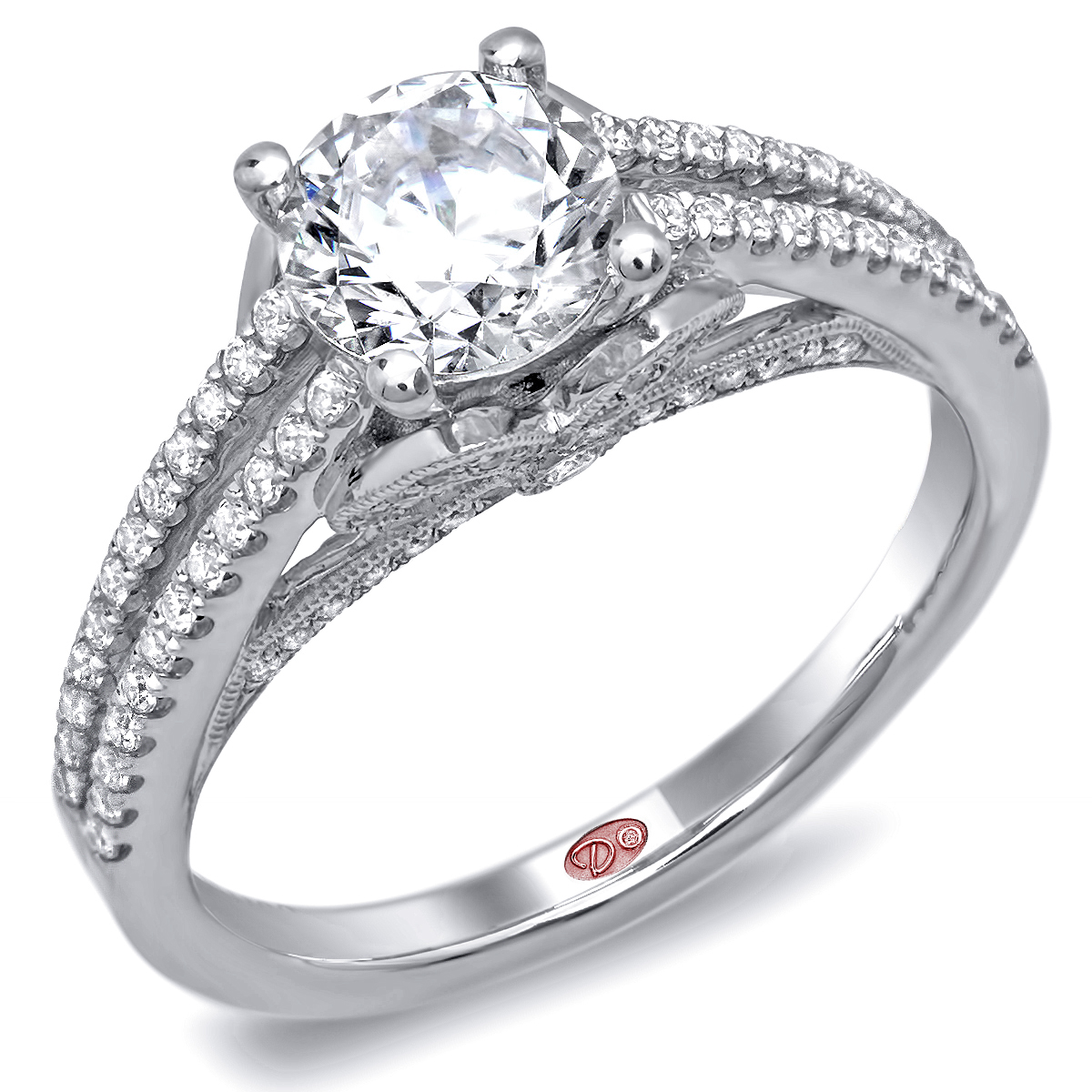 Cathedral setting split shank engagement ring featuring pavé-set round diamonds set halfway down the shank with a ribbon design and milgrain edging.