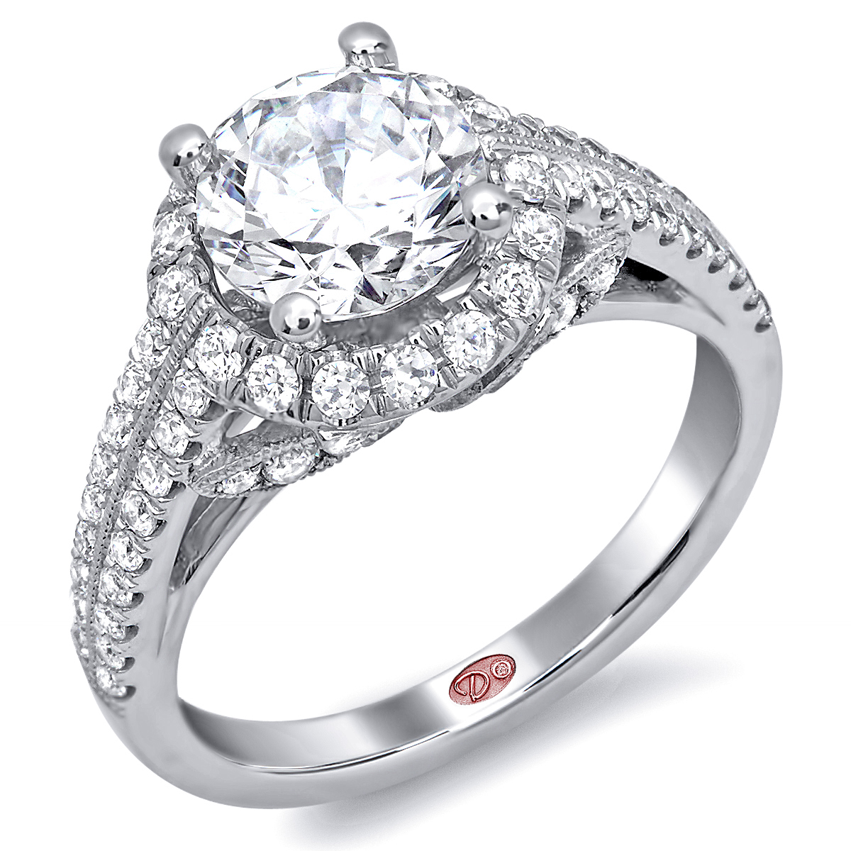 Cathedral setting round halo engagement ring featuring pavé-set round diamonds set 3/4 down the shank with a leaf design and milgrain edging.