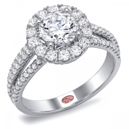 Cathedral setting split shank round halo engagement ring featuring pavé-set round diamonds set halfway down the shank.