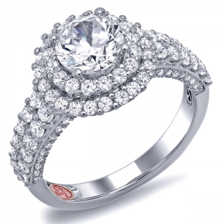 Flat setting double round halo engagement ring featuring prong-set round diamonds and pavé-set round diamonds set halfway down the shank.