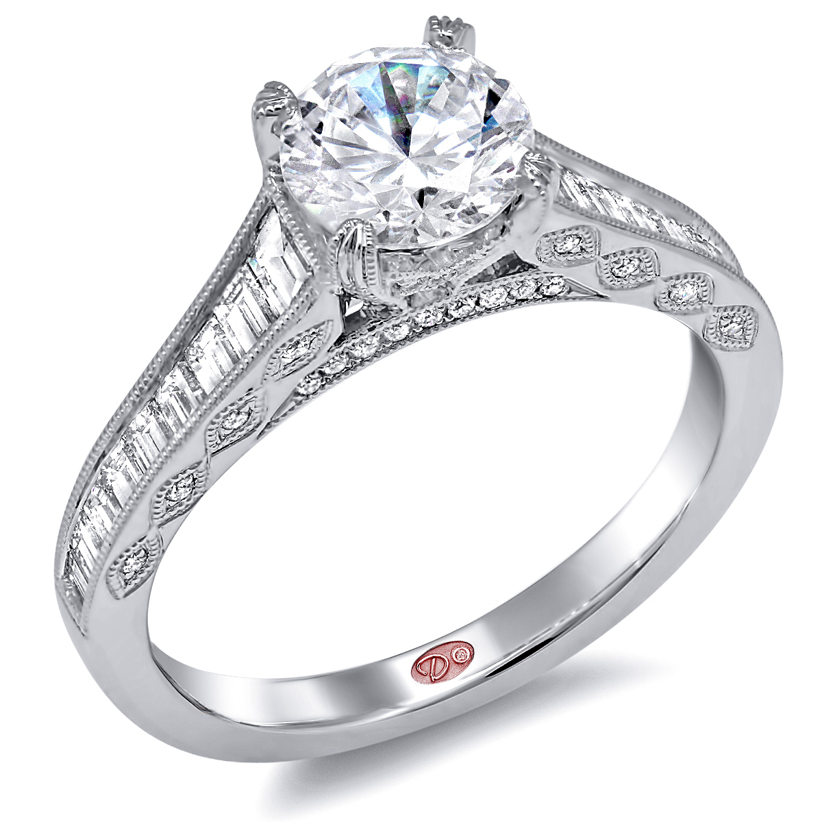 Cathedral setting tapered shoulder engagement ring featuring channel-set baguette diamonds and pavé-set round diamonds set halfway down the shank with milgrain edging.