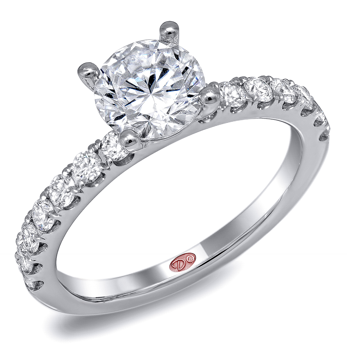 Flat setting single-row engagement ring featuring pavé-set round diamonds set halfway down the shank.