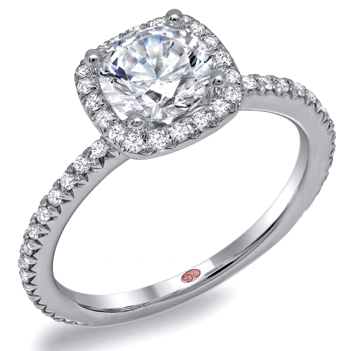 Flat setting single-row cushion halo engagement ring featuring pavé-set round diamonds set 3/4 down the shank.