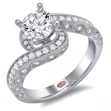 Cathedral setting twisted shoulder engagement ring featuring pavé-set round diamonds set halfway down the shank with milgrain edging.