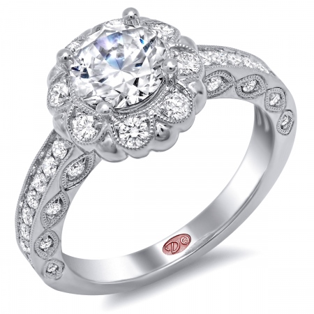 Cathedral setting floral round halo engagement ring featuring pavé-set round diamonds set halfway down the shank with milgrain edging.