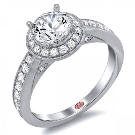 Cathedral setting single-row round halo engagement ring featuring pavé-set round diamonds set halfway down the shank with milgrain edging.