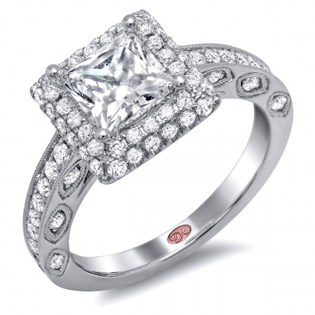 Cathedral setting square halo engagement ring featuring pavé-set round diamonds set halfway down the shank with milgrain edging.