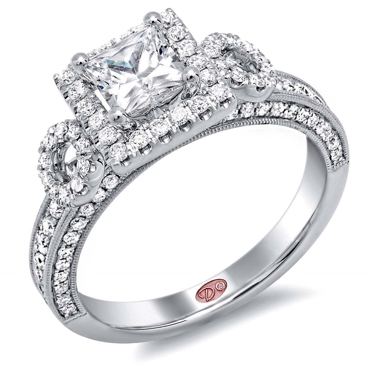 Flat setting square halo engagement ring featuring pavé-set round diamonds set halfway down the shank with milgrain edging.