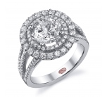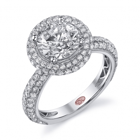 Flat setting round halo engagement ring featuring pavé-set round diamonds set underneath the halo and 3/4 down the shank with milgrain edging.