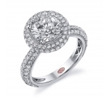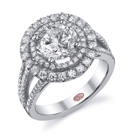 Cathedral setting split shank double round halo engagement ring featuring pavé-set round diamonds set halfway down the shank.