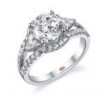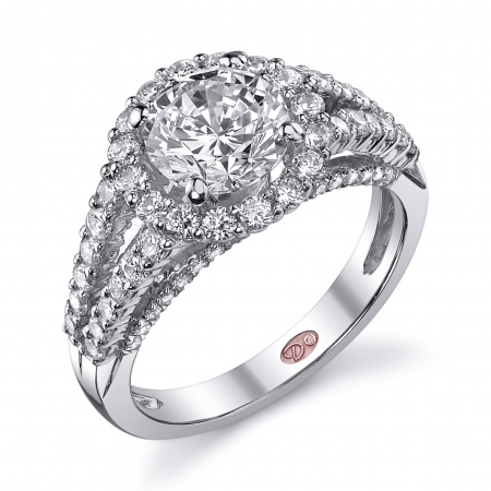 Cathedral setting split shank round halo engagement ring featuring pavé-set round diamonds set halfway down the shank.