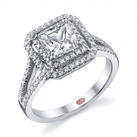 Cathedral setting split shank double cut corner halo engagement ring featuring pavé-set round diamonds set halfway down the shank.