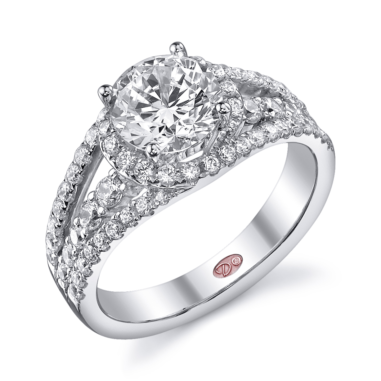 Cathedral setting split shank round halo engagement ring featuring pavé-set round diamonds set halfway down the shank.