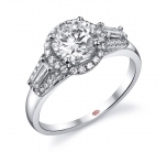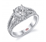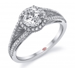 Cathedral setting split shank round halo engagement ring featuring pavé-set round diamonds set halfway down the shank.