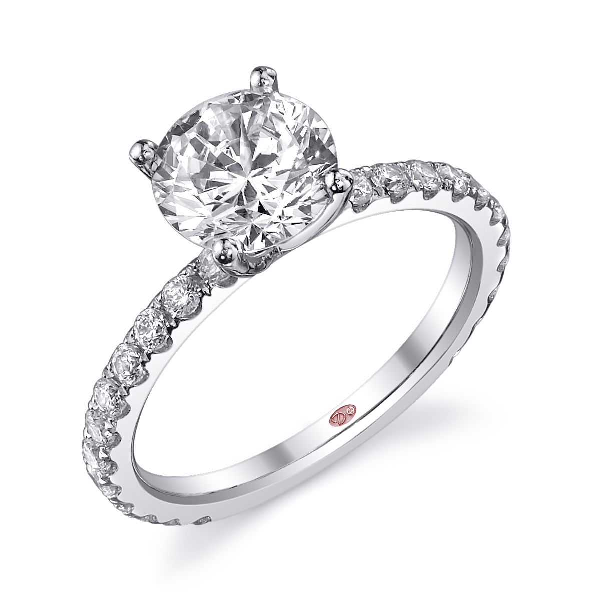 Cathedral setting single-row engagement ring featuring pavé-set round diamonds set 3/4 down the shank.