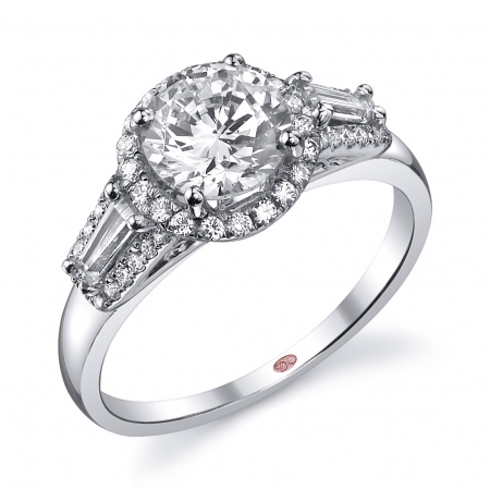 Cathedral setting tapered shoulder three-stone round halo engagement ring featuring prong-set baguette diamond side stones and pavé-set round diamonds set around the center stone and side stones.