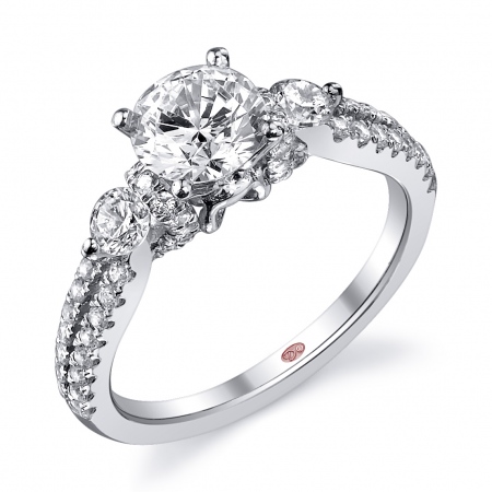 Cathedral setting split shank three-stone engagement ring featuring prong-set round diamond side stones and pavé-set round diamonds set halfway down the shank.