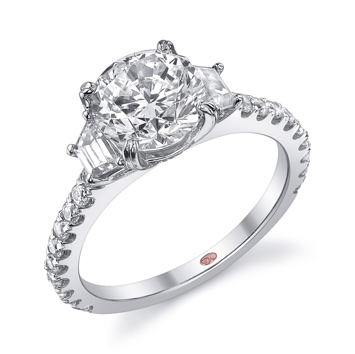 Cathedral setting single-row three-stone engagement ring featuring prong-set baguette diamond side stones and pavé-set round diamonds set 3/4 down the shank.