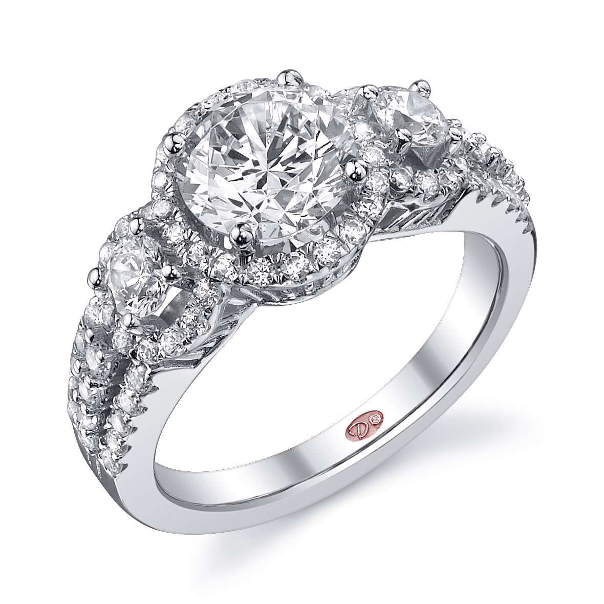 Cathedral setting split shank three-stone round halo engagement ring featuring prong-set round diamond side stones and pavé-set round diamonds set halfway down the shank.