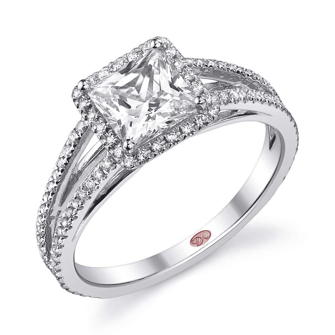 Cathedral setting split shank square halo engagement ring featuring pavé-set round diamonds set 3/4 down the shank.