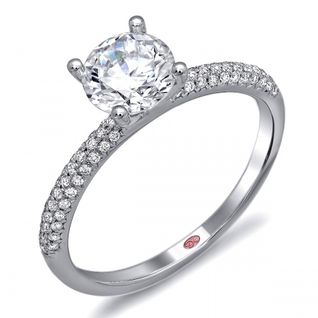 Flat setting engagement ring featuring pavé-set round diamonds set halfway down the shank.