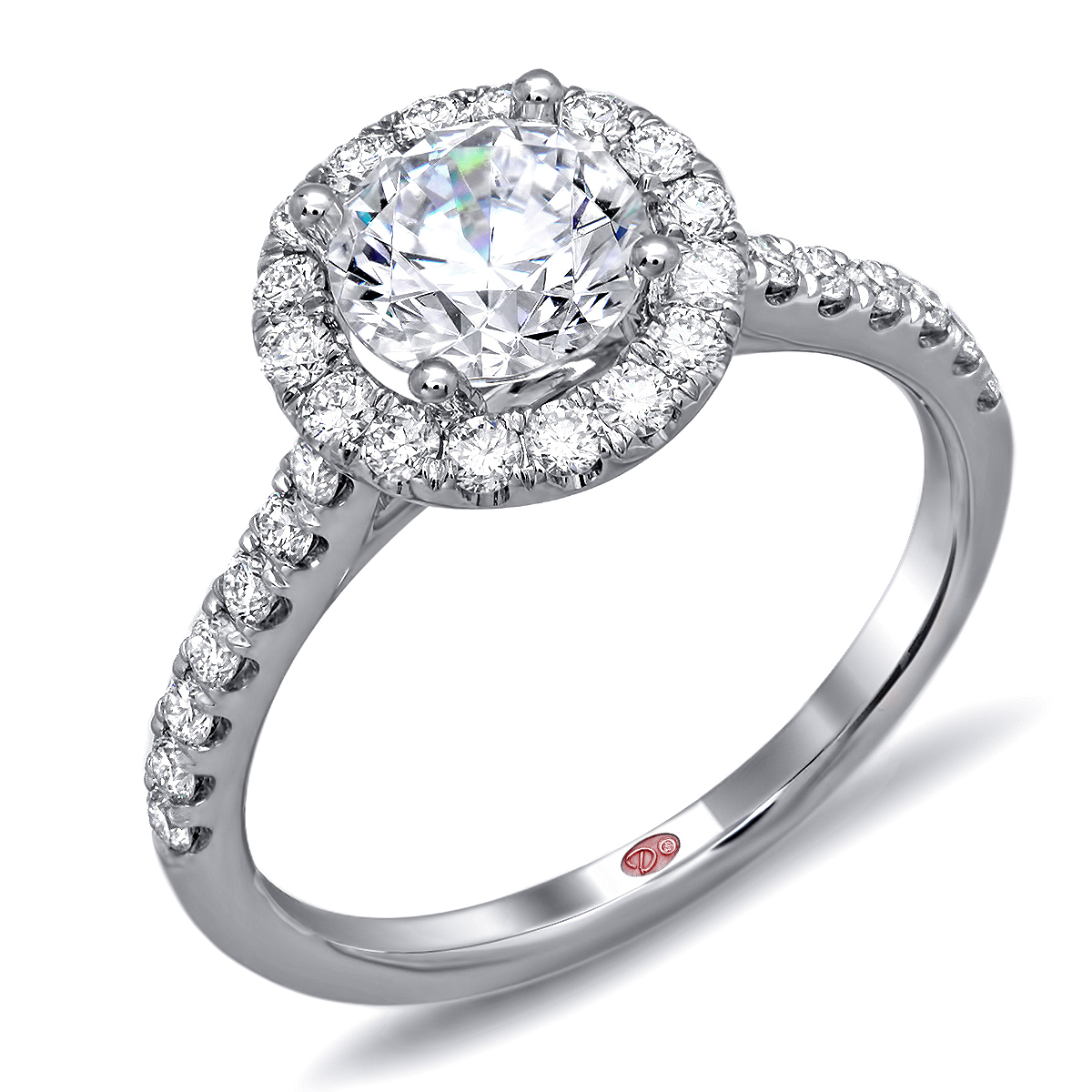 Cathedral setting single-row round halo engagement ring featuring pavé-set round diamonds set halfway down the shank.