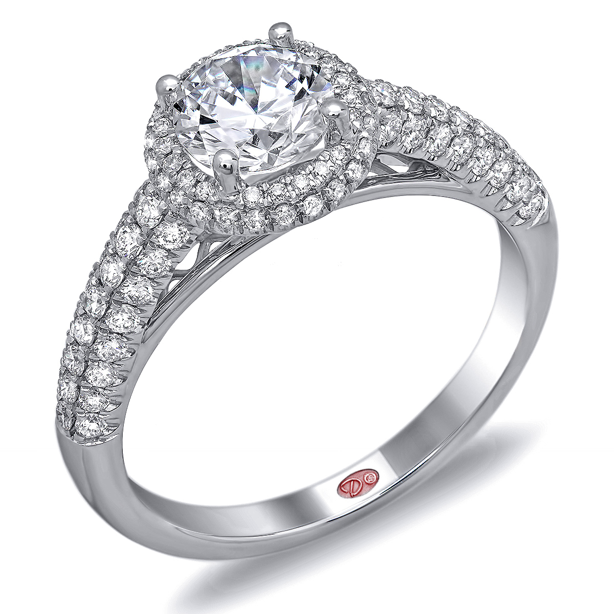 Cathedral setting round halo engagement ring featuring pavé-set round diamonds set halfway down the shank.