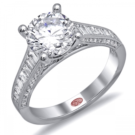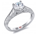 Cathedral setting tapered shoulder engagement ring featuring channel-set baguette diamonds and pavé-set round diamonds set halfway down the shank with milgrain edging.