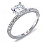 Cathedral setting tapered shoulder engagement ring featuring pavé-set round diamonds set halfway down the shank with milgrain edging.