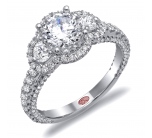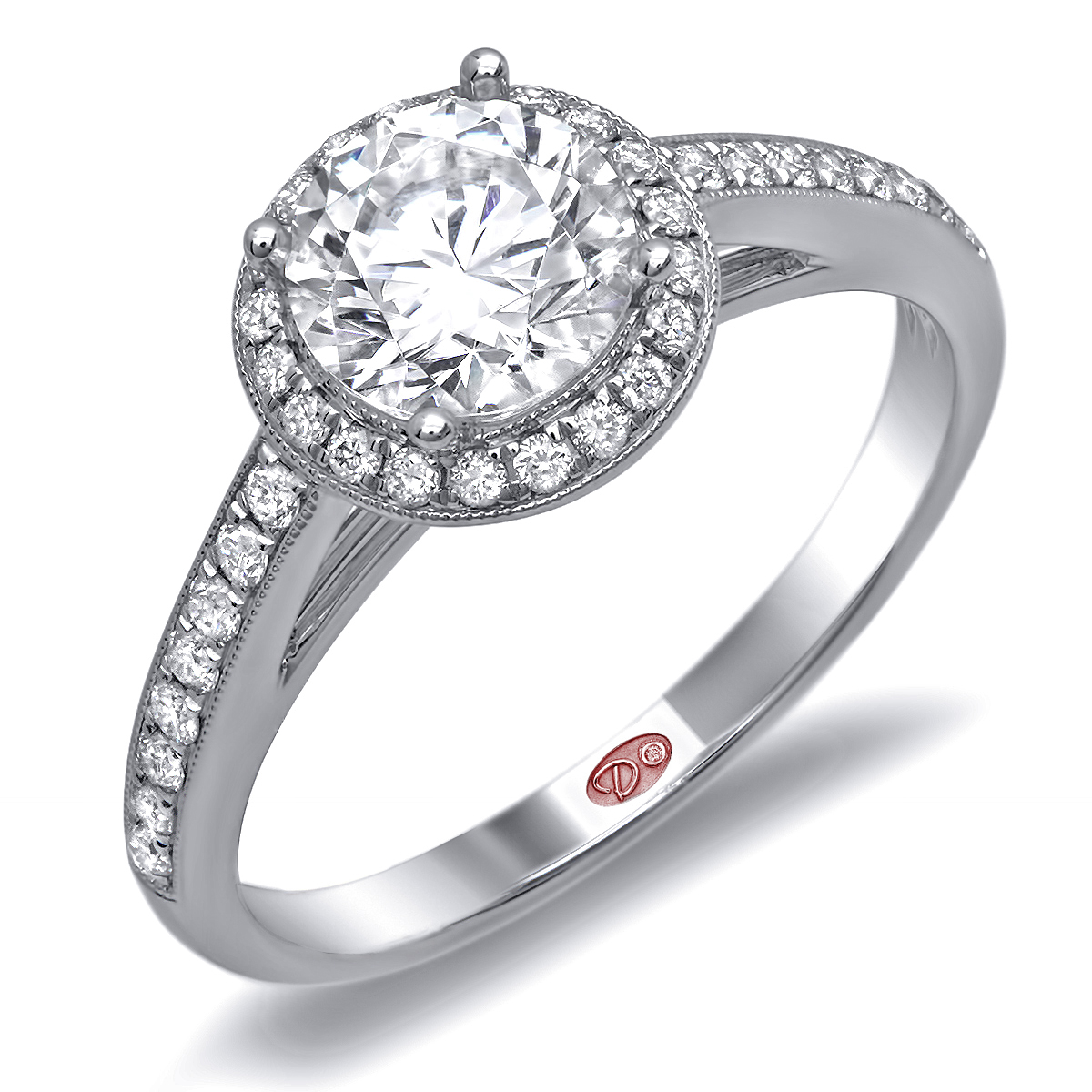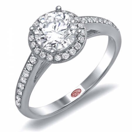 Cathedral setting single-row round halo engagement ring featuring pavé-set round diamonds set halfway down the shank with milgrain edging.