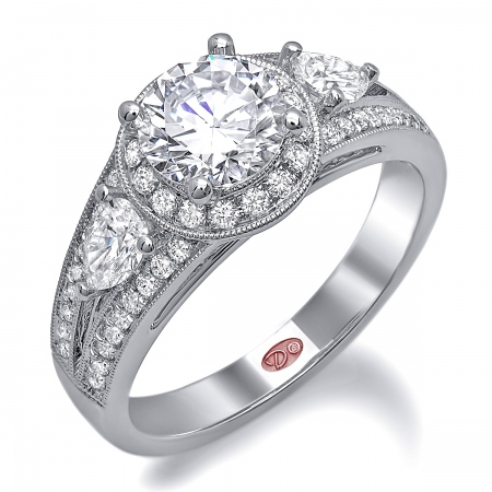 Cathedral setting split shank three-stone round halo engagement ring featuring prong-set pear-shape diamond side stones and pavé-set round diamonds set halfway down the shank with milgrain edging.