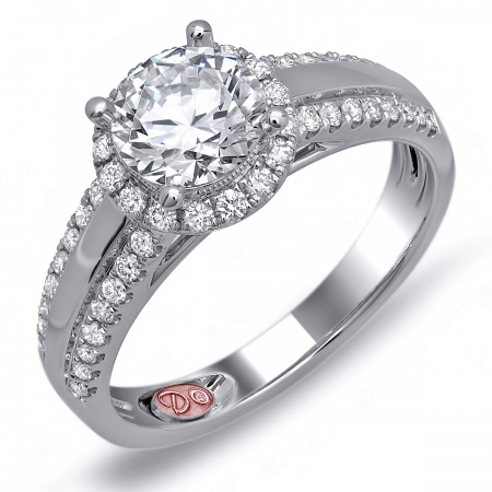 Cathedral setting round halo engagement ring featuring pavé-set round diamonds set halfway down the shank with milgrain edging on the halo's inner edge.