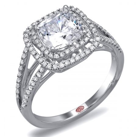 Cathedral setting split shank double cushion halo engagement ring featuring pavé-set round diamonds set halfway down the shank.