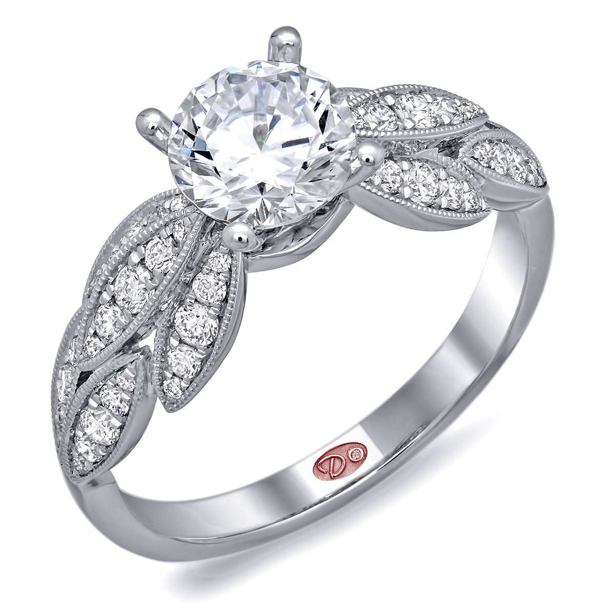 Cathedral setting tapered shoulder floral engagement ring featuring pavé-set round diamonds set halfway down the shank with milgrain detail.