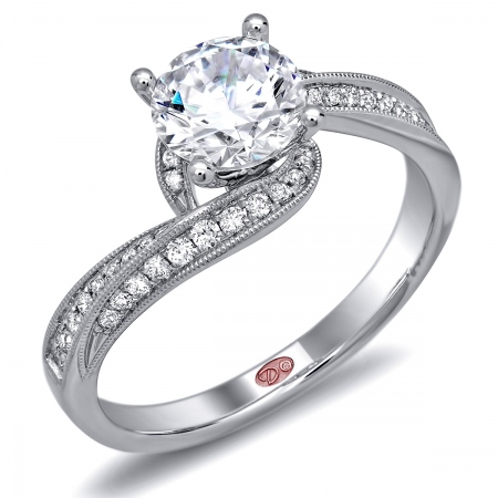 Flat setting twisted shoulder engagement ring featuring pavé-set round diamonds set halfway down the shank with milgrain edging.