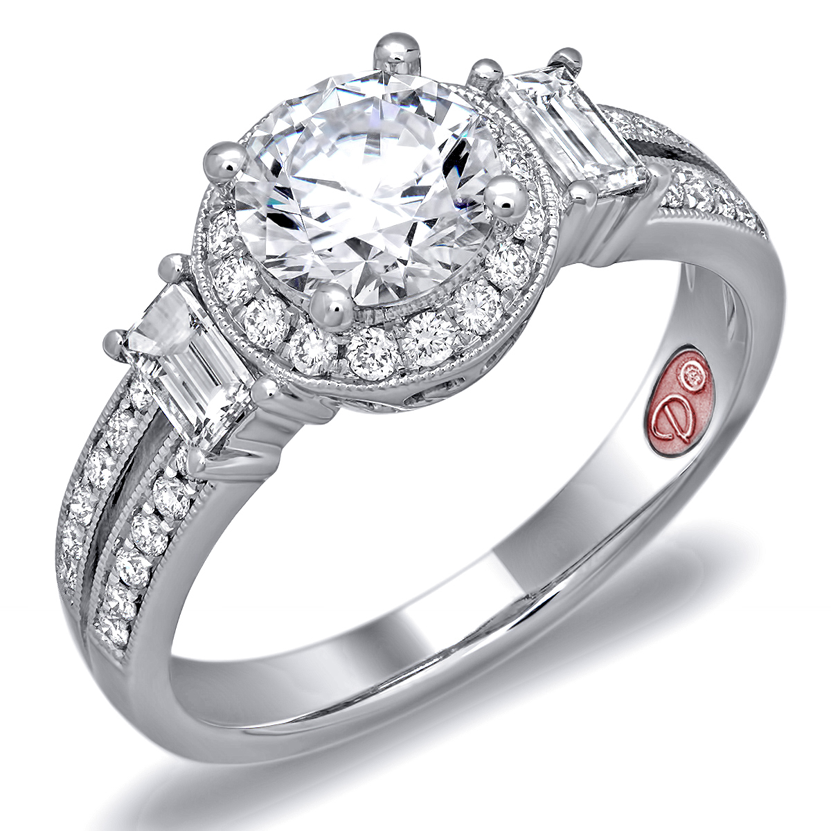Flat setting three-stone round halo engagement ring featuring prong-set baguette diamond side stones and pavé-set round diamonds set halfway down the shank with milgrain edging.