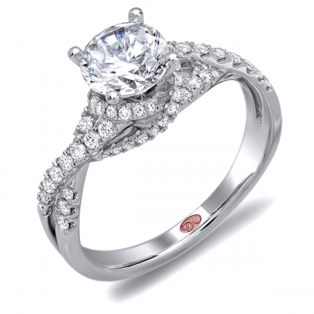 Cathedral setting twisted shoulder engagement ring featuring pavé-set round diamonds set halfway down the shank.
