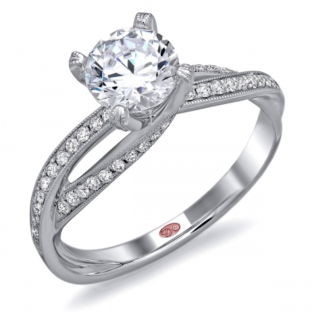 Cathedral setting twisted shoulder engagement ring featuring pavé-set round diamonds set halfway down the shank with milgrain edging.