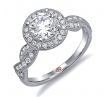 Cathedral setting round halo engagement ring featuring filgree detail and pavé-set round diamonds set 3/4 down the shank with milgrain edging.