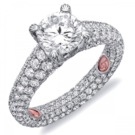 Cathedral setting engagement ring featuring pavé-set round diamonds set all the way inside and outside of the shank.
