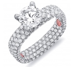 Flat setting engagement ring featuring pavé-set round diamonds set all the way inside and outside of the shank.