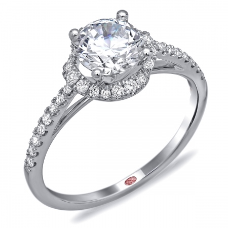 Cathedral setting single-row round halo engagement ring featuring pavé-set round diamonds set halfway down the shank.