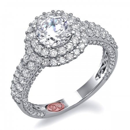 Flat setting round double halo engagement ring featuring prong-set round diamonds and pavé-set round diamonds set 3/4 down the shank.