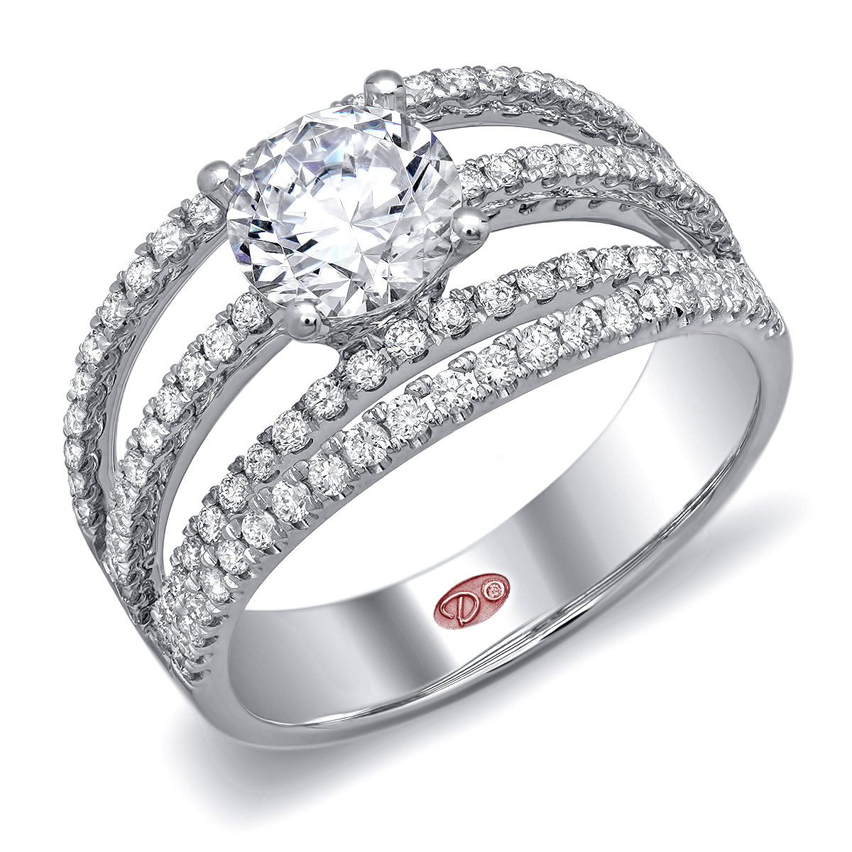 Flat setting split shank engagement ring featuring pavé-set round diamonds set halfway down the shank.