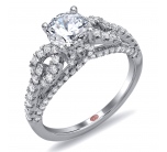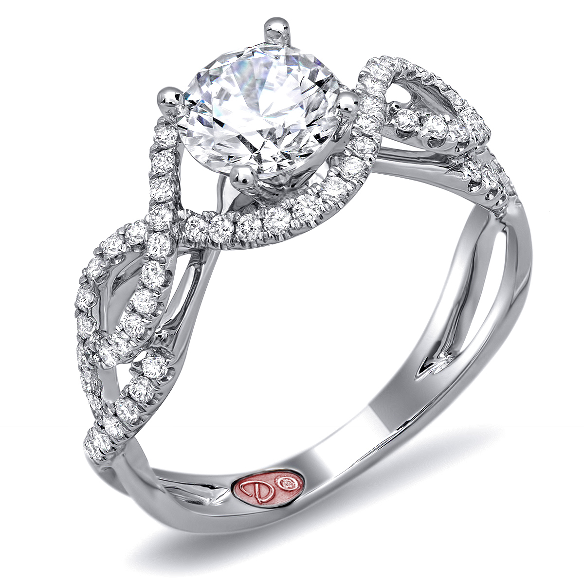Cathedral setting split shank twisted shoulder engagement ring featuring pavé-set round diamonds set halfway down the shank.
