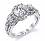 Cathedral setting split shank three-stone round halo engagement ring featuring prong-set round diamond side stones and pavé-set round diamonds set halfway down the shank.