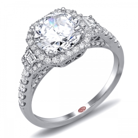 Cathedral setting single-row three-stone cut corner halo engagement ring featuring prong-set baguette diamond side stones and pavé-set round diamonds set halfway down the shank with milgrain edging.