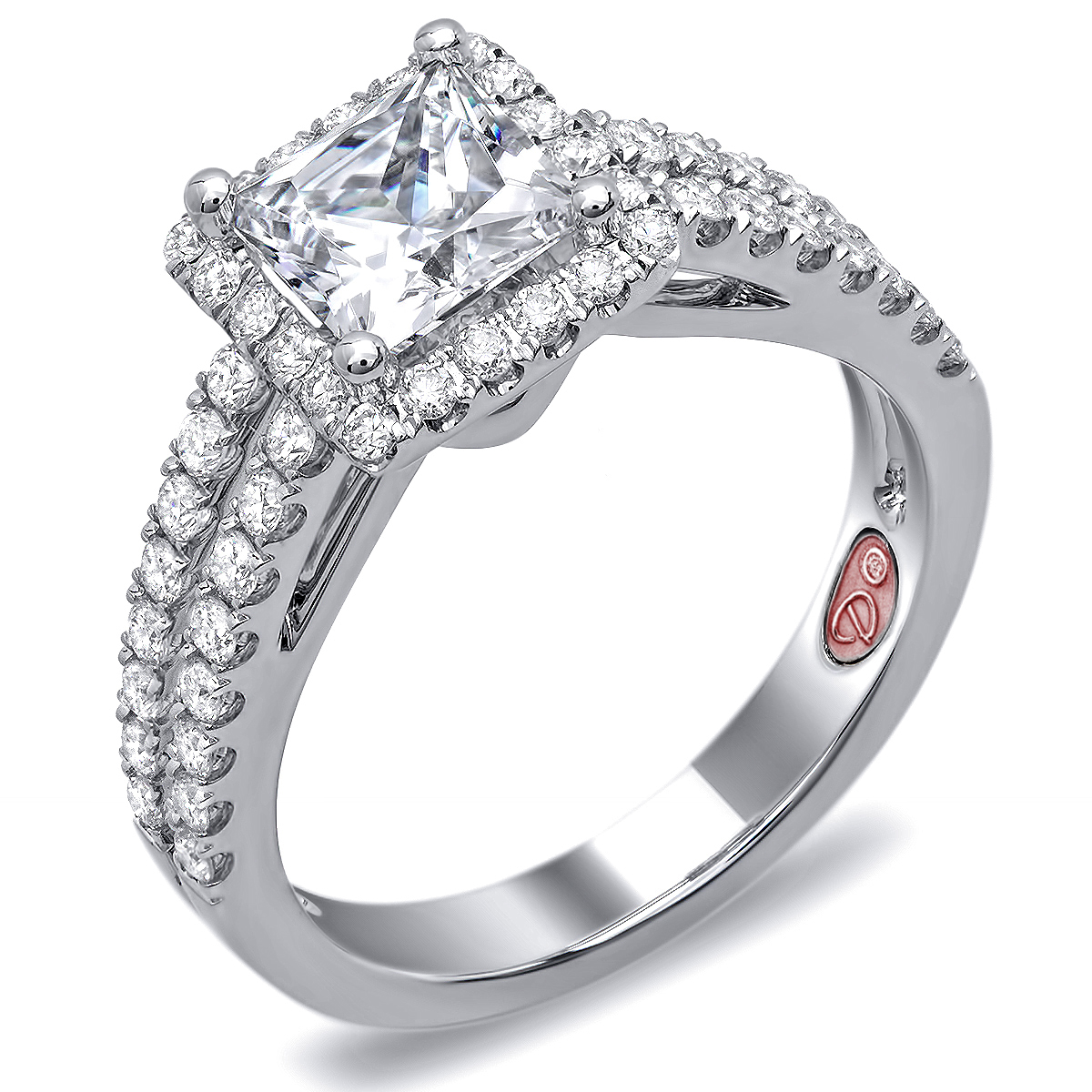Cathedral setting split shank square halo engagement ring featuring pavé-set round diamonds set halfway down the shank.