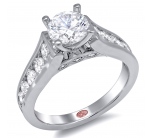 Cathedral setting engagement ring featuring pavé-set round diamonds set 3/4 down the shank with milgrain edging.